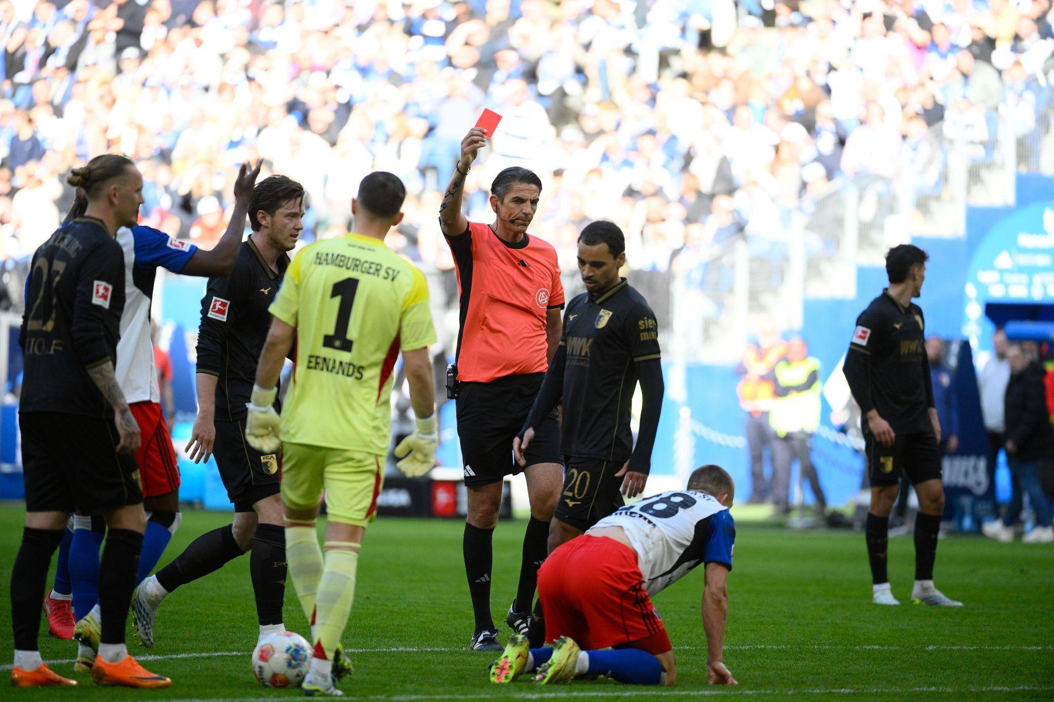 Doch schon vier Minuten später brachte sich der HSV in neue Nöte, als Muheim den Ball verstolperte, den auf das HSV-Tor eilenden Augsburger Anton Kade foulte und dafür die Rote Karte sah.